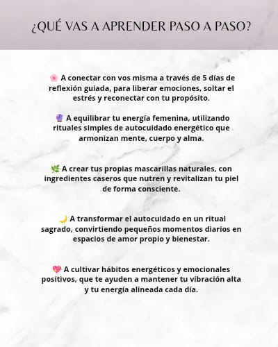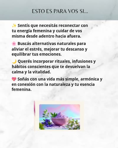 Este ebook está diseñado para ayudarte a volver a vos misma a través de prácticas simples, naturales y femeninas.